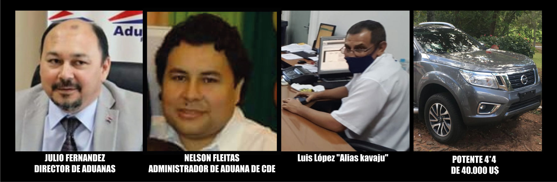 Nos referimos a este protegido de la mafia aduanera el tal Luis López, cuentan que una vez que saltó el escándalo de los insumos médicos el mencionado funcionario fue sigiloso y rápidamente reasignado para no ser imputado al puesto no menos apetitoso del puente de la amistad. Esta clase de funcionarios públicos como muchos que se burlan de la ciudadanía y se vuelven multimillonarios y son siempre protegidos por sus cómplices, encubridores y por los jefes de turno hoy por Julio Fernández Frutos Director de aduanas. Como así también, está protegido por el “Cabezón” Nelson Fleitas, otro gran corrupto y coimero en la aduana de Ciudad del Este, que con dinero del estado, según dicen las fuentes, este se hizo un trasero nuevo que pago ndaje 1 300 000 000 Mil trescientos millones de guaraníes, además a su cómplice amante, según rumores de varios aduaneros allegados a este medio, nos relataron que le compro a la tal Marta Gómez una camioneta color blanco KIA Sportage 2020. Y por si todo fuera poco, aparece en el paquete una camioneta Nissan gris oscuro potente 4X4, sin chapa y de 40.000 U$ guardado en la habitacional de Funcionarios de Aduana de Ciudad del Este, que Luis Lopez alias Kavaju, se compró en estos días que preside como el Jefe de Resguardo, donde Charlie Friends descubrió lo que este trató de esconder. Guauuu!!! Que suerte de este tipo, que dice que no hay nada ndaje en la Aduana, pero todos los que ingresas del grupo de protegidos del Director, en pocas semanas adquieren sus vehículos de alta gama nuevitos, pe pilla lo mita? Y dicen que no hay ndaje corrupción y coima en las aduanas del país ja ja Jairo jagua to’u pende bola Julio Fernandez y Cabezón Fleitas.