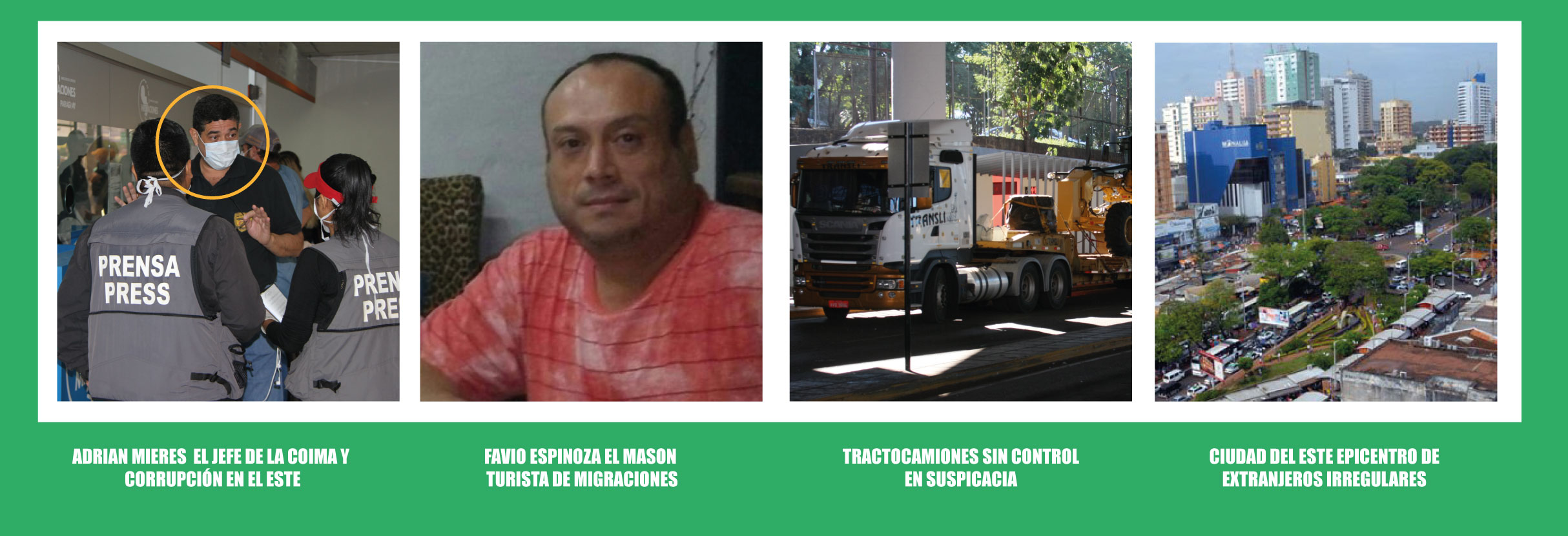 De fuentes fidedignas sabemos que se dedica a este operativo y él no deja o no da la orden para que los controles sean exhaustivos en camiones de gran porte, en colectivos, en vehículos, en fin no hace lo que rige la institución, llega a su lugar de trabajo de Asunción los días que quiere, a veces martes, a veces miércoles, hace lo que quiere, siendo un funcionario público debe estar Lunes a las siete de la mañana en su puesto de trabajo, como cualquier funcionario, pero este no. Y lo más cómico es que ahora descubrimos que hay dos sub-jefes que cuando él no está deben hacer los vericuetos de los sellitos de las dádivas y otros cobros colindantes, ejercicios para la coima, ya sea de extranjeros irregulares o con antecedentes. Aah, el tal Ever Gonzáles y el otro Hugo faca, dicen que son los jefes que cuando él no está se las ingenian para el “Clin caja” y así por delante va esta institución que debería tener el control total de quién entra y quién sale, no tendríamos problemas cuando ingresó el Rey de la Efedrina Ibar Pérez Corradi, Fabricio Santos da Silva alias Gurí o nene, recientemente capturado en Hernandarias, que viven tranquilamente contando con un frondoso antecedente, no tendrían problemas en obstaculizar el ingreso ni dejar ingresar a un individuo de esta magnitud, así como otros también viven en CDE y alrededores en las sombras de alguna alcoba, pero ellos nunca ven, tal vez hasta se enteren, pero evidentemente algún arreglo hubo!! Es 98% seguro… Esta narra continuará con los periplos de Marcos Estigarribia y Hugo Guillermo Vera Oviedo, de los documentos fraguados y mamotretos de la Dirección General de Migraciones.