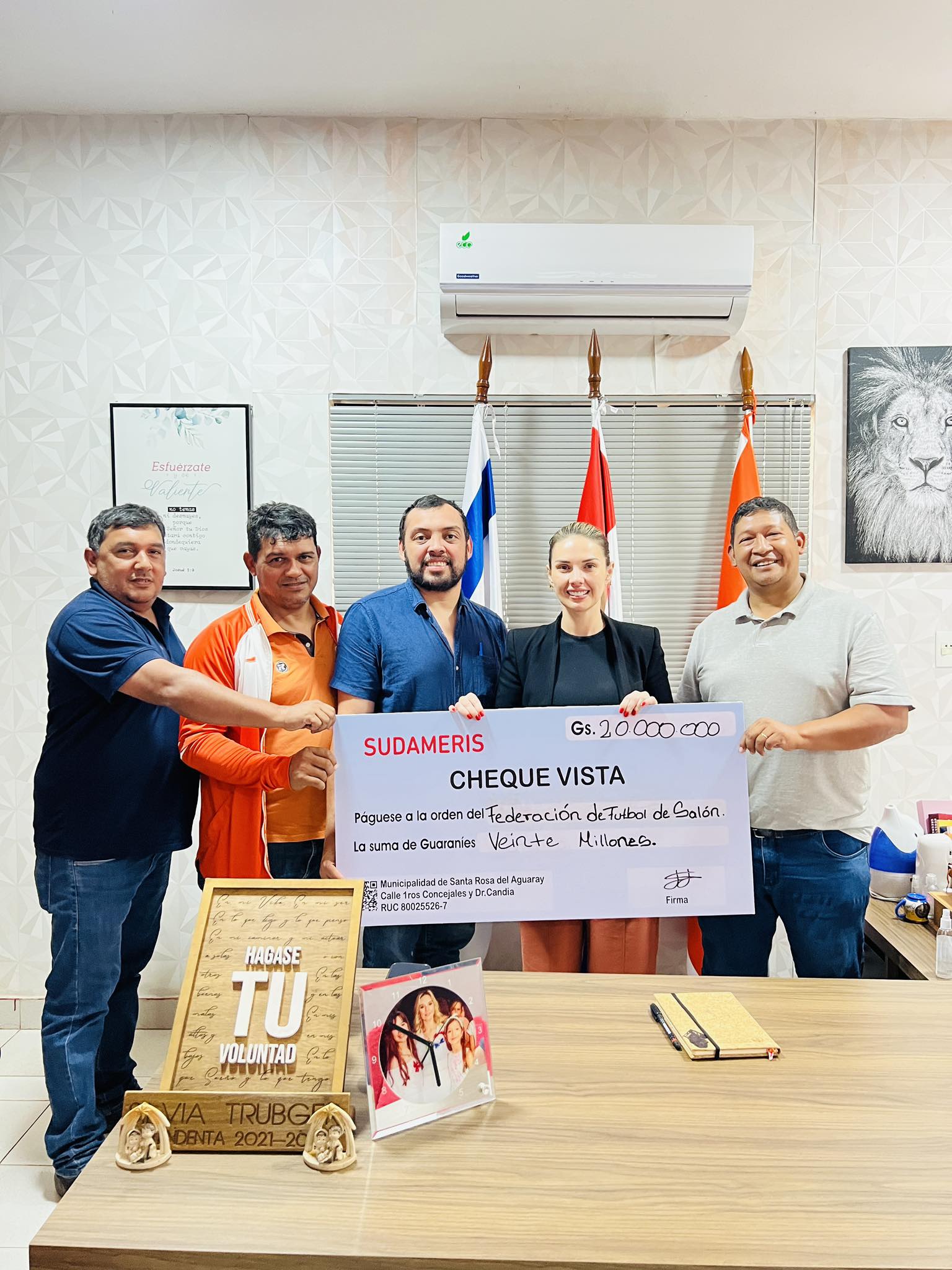 SAN PEDRO DEL YKUAMANDIJU (Locales por Norteñita) La Municipalidad de Santa Rosa del Aguaray, en el departamento de San Pedro, concretó la entrega de un aporte económico de Gs. 20.000.000 a la Federación Paraguaya de Fútbol de Salón. El monto será destinado a la compra de atuendos deportivos para la Selección de Mayores masculina y femenina, en el marco de la etapa clasificatoria del campeonato nacional.
