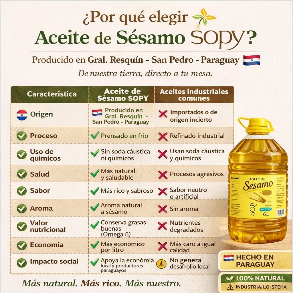 El emprendimiento familiar, que desde hace años se dedica a la exportación de granos a mercados internacionales, ha dado un paso significativo hacia el valor agregado con la fabricación de aceite de sésamo bajo la marca «SOPY», un producto que ha logrado posicionarse favorablemente en el mercado local gracias a su calidad y aceptación.